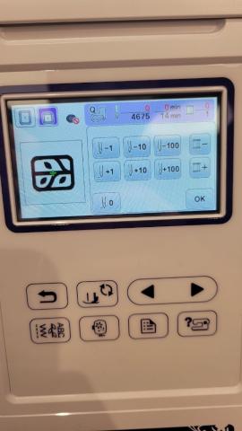 Should you encounter an issue, you will often have an option to recall the previous job. You can then use the needle position button (looks like an embroidery symbol when your design is set) to- move your needle start point to later in a job. This way you will not have to re embroider the same area. Use the buttons to increase or decrease your step count.