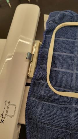 - Place the hoop unto the mounting brackets located on the Embroidery Attachment (Shown right). This should be removed from the machine. Align the two pins on the embroidery frame holder with the mounting brackets on the frame, and then press the frame into the embroidery frame holder until a click is heard.