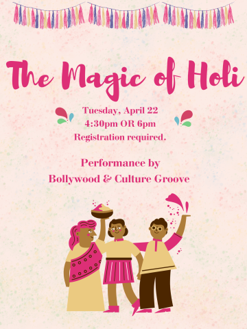 Join us for an exciting celebration of color, dance, and joy! Discover Holi’s vibrant traditions and move to fun beats in this interactive workshop by Bollywood & Culture Groove.