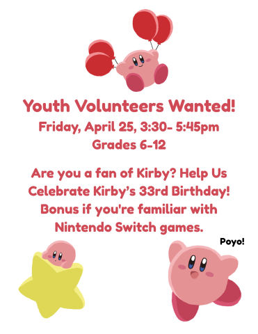 Volunteers grades 6-12 needed to help with Happy Birthday Kirby event.