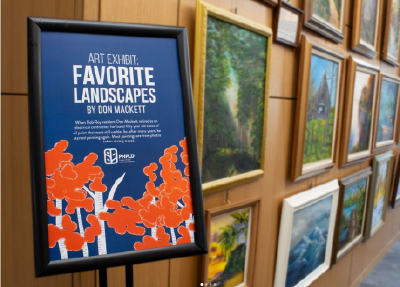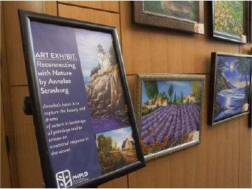 Creativity, expression, and opportunities for shared learning and thought, are important aspects of our space and mission as a public library (linking to a world of ideas). Local monthly art exhibits can be found between our main entrance and our cafe area.