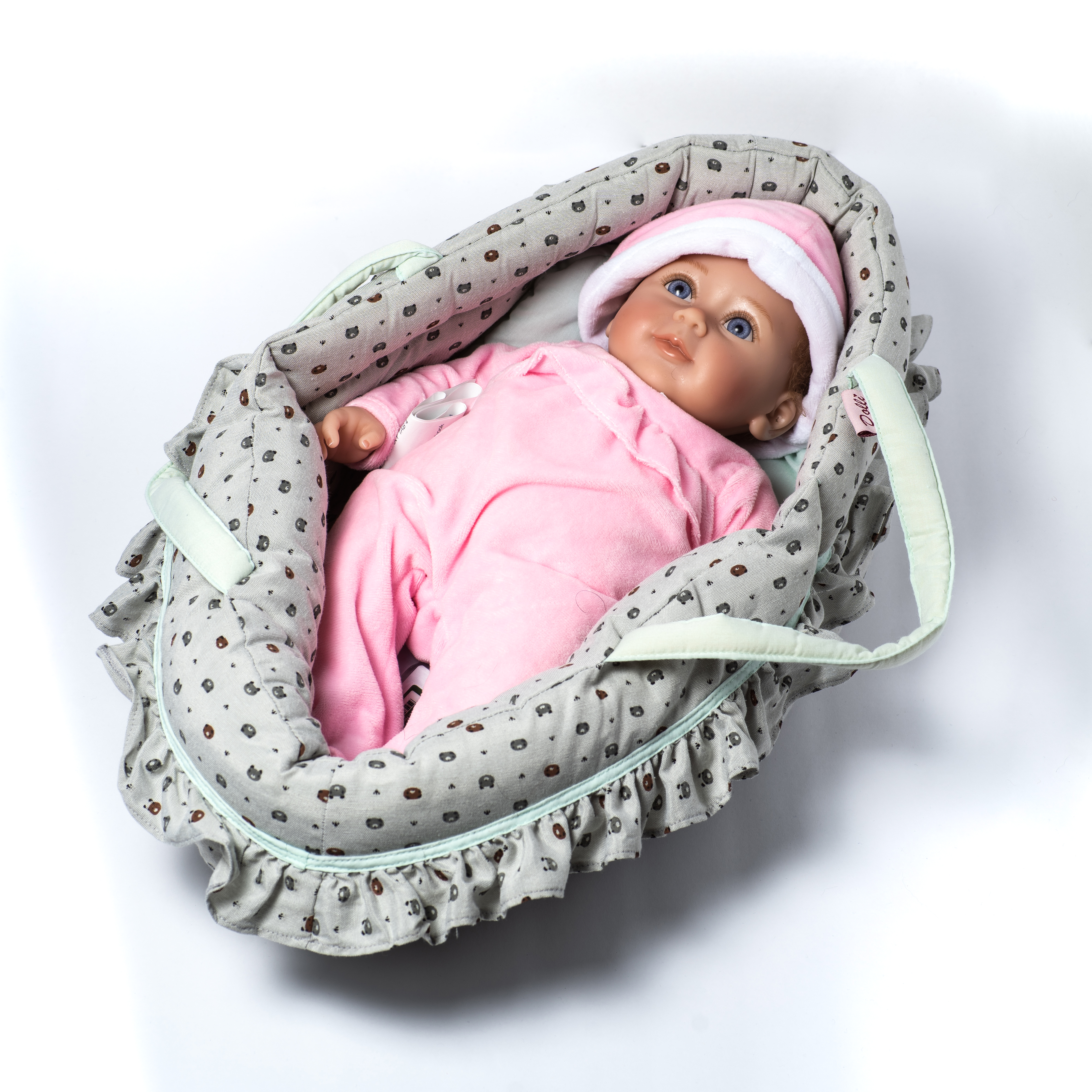 therapy doll, pink velour sleeper, pink velour cap, soft doll carrier with pillow, information booklet, therapy information sheet