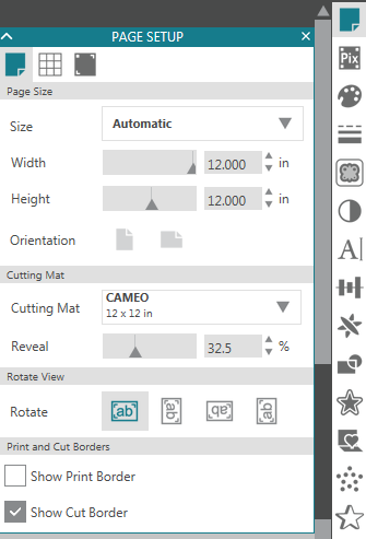Page Setup Menu – changes how your cutting area appears. Make sure the cutting area matches the size of the material you are using. You can adjust the width and height. You might also want to reveal the cutting mat to increase the accuracy of your material placement.